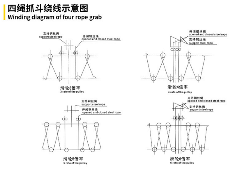 在各類起重機上,配有兩組電機卷筒(即電動葫蘆),每組卷筒引出兩根鋼絲繩,其中兩根組成一組分別生根在抓斗平衡架端作支持用,另一組鋼絲繩經(jīng)過上橫梁的滑輪與下橫梁的滑輪,組成滑輪組,起開閉斗部作用。