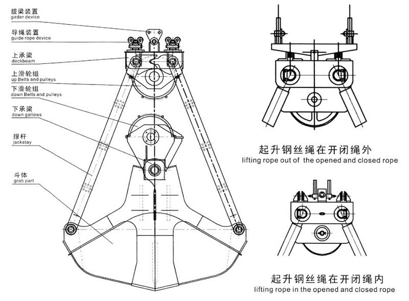 工作開始時,支持鋼絲繩將抓斗起吊在適當?shù)奈恢蒙,然后放下開閉鋼絲繩,這時靠下橫梁的自重迫使斗部以下橫梁大軸為中心將斗部打開,當斗部開到兩耳板的碰塊相撞時,即斗部打開到最大極限。開斗時,上橫梁滑輪和下橫梁滑輪中心距加大,然后支持鋼絲繩落下,將已打開的抓斗,落在要抓取的松散堆積物上面,再收繞開閉鋼絲繩,將上橫梁滑輪與下橫梁滑輪的中心距恢復到原來的位置,這樣就完成了抓取物料的過程。在閉合的斗部里已經(jīng)裝滿了物料,最后同時提升開閉和支持鋼絲繩,整個抓斗即被吊起,經(jīng)起重機移動到所需卸料場地上,開斗卸下所抓取的物料。