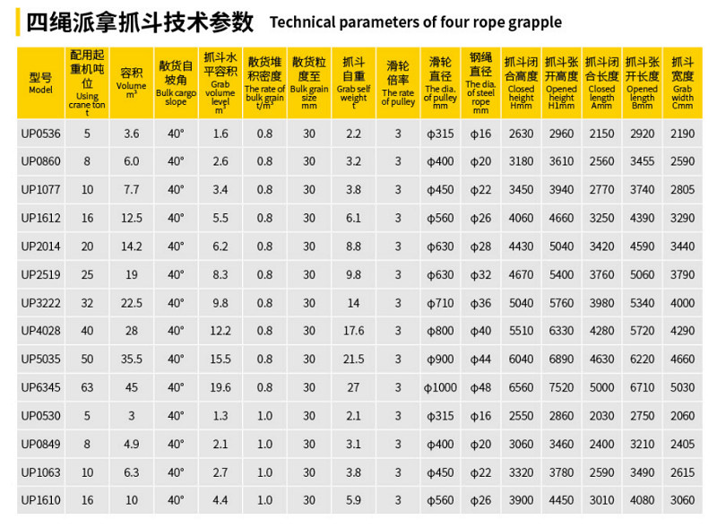 應(yīng)用:UP系列派拿雙顎瓣抓斗造型新穎、結(jié)構(gòu)合理、抓取物料重量與抓斗自重之比達(dá)到1.5~1.92,充滿度達(dá)到95%~100%是最小粒度松散物的理想抓具。與傳統(tǒng)的普通四繩抓斗相比較有以下特點(diǎn):下承梁架構(gòu)縮短、強(qiáng)度好、自重輕;主要鉸點(diǎn)的襯套材質(zhì)為軸承鋼。延長(zhǎng)使用壽命4~5倍,刃口板合縫間隙小,可達(dá)到0.3mm~1mm能保持作業(yè)場(chǎng)所清潔,整體結(jié)構(gòu)不易變形不錯(cuò)口,本類型抓斗可設(shè)計(jì)為雙繩。