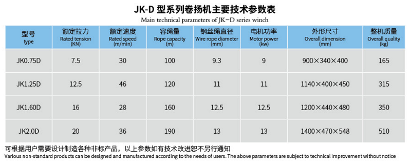 JK-D型系列卷揚(yáng)機(jī)是采用少齒差行星傳動(dòng)的新型卷揚(yáng)機(jī),是目前傳統(tǒng)卷揚(yáng)機(jī)更新?lián)Q代的理想產(chǎn)品。它具有結(jié)構(gòu)緊湊、運(yùn)行平穩(wěn)、操作方便、維護(hù)簡單、低噪音、使用壽命長等優(yōu)點(diǎn)。廣泛應(yīng)用于建筑施工、碼頭、橋梁、冶金等行業(yè)的起重與安裝。
